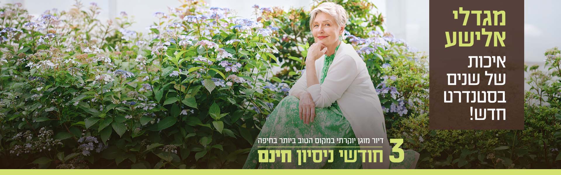 אנו במגדלי אלישע יודעים שההחלטה לעבור לדיור מוגן היא צעד משמעותי עבורכם אשר כרוך בלא מעט דילמות ולכן, אנו מזמינים להתנסות למשך 3 חודשים ללא עלות בהם תוכלו להתרשם מסטנדרט חדש של איכות חיים במרכז הכרמל, ממבחר דירות חדשות ומעוצבות, מחיי חברה ענפים ומכל השירותים שאנו מעמידים לרשותכם.